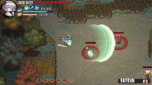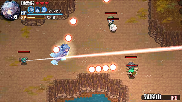 DASH:带有无敌帧的冲刺,用来躲避攻击,同时DASH时会附带一些特别效果,如琪露诺在冲刺时如果擦到敌人,会将对方短暂的冻结一小段时间;妖梦DASH时擦到敌人会直接产生伤害等,每个人物DASH的附加效果各不相同。